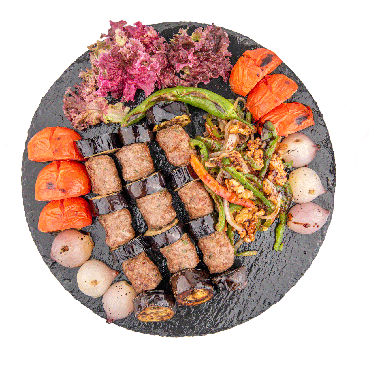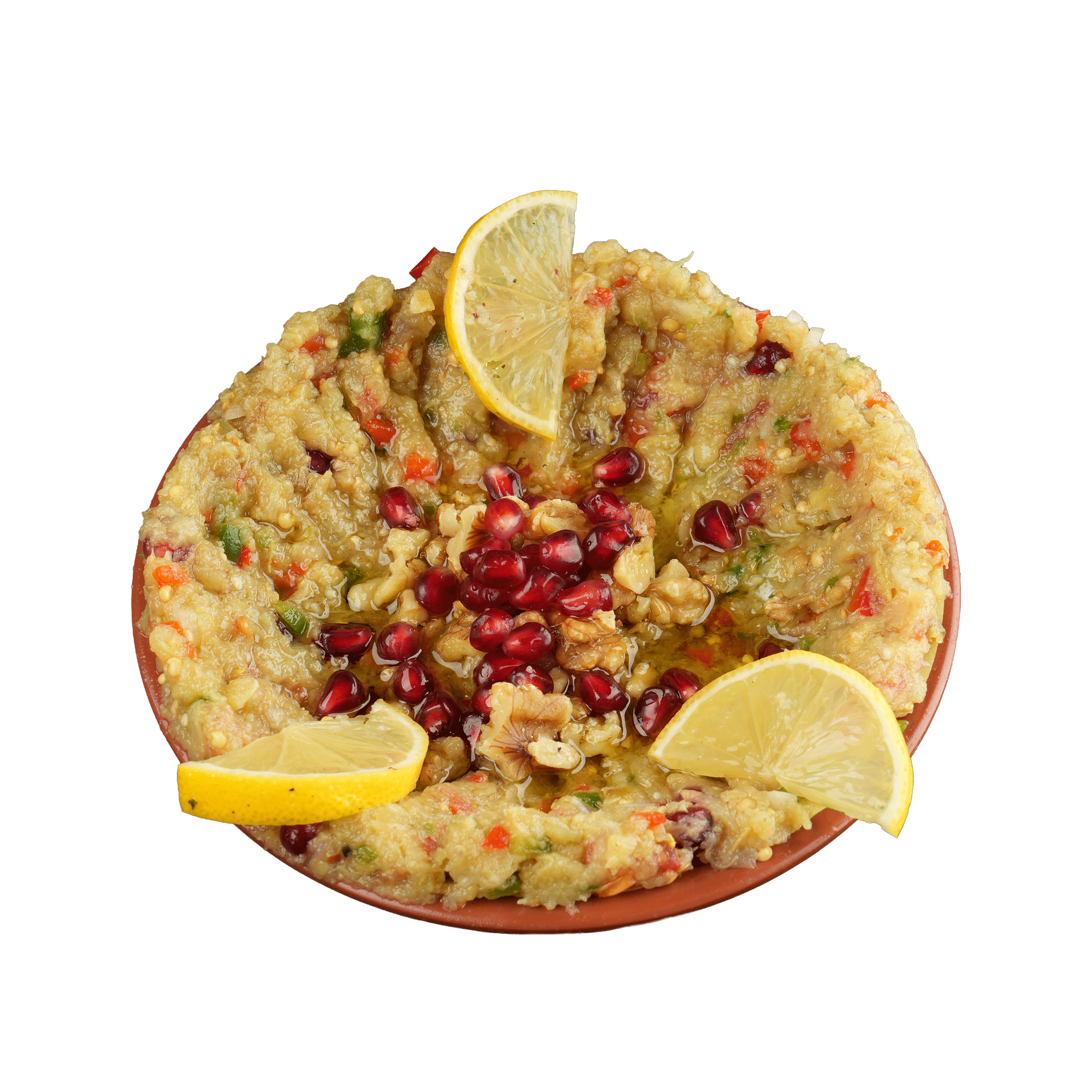 Roasted eggplant blended with diced vegetables, lemon juice, and herbs.
