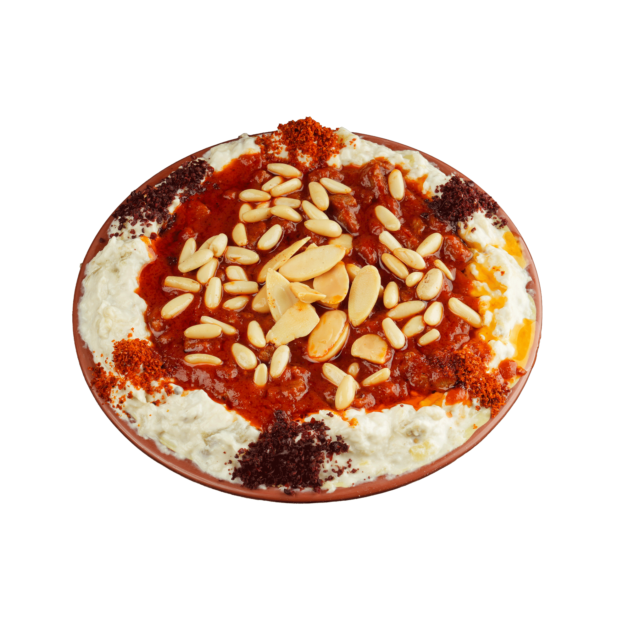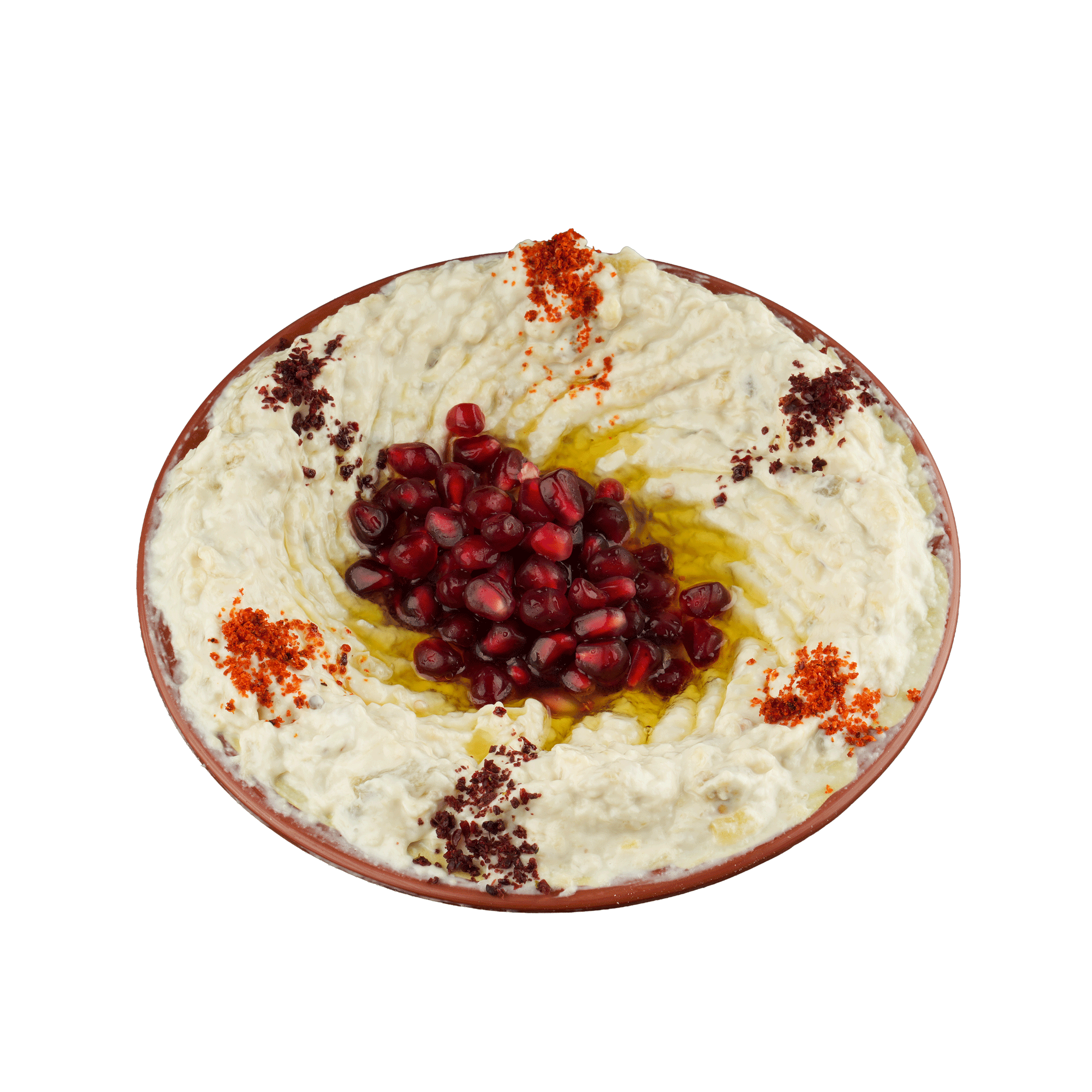 A flavourful blend of hummus and creamy roasted eggplant, topped with olive oil.